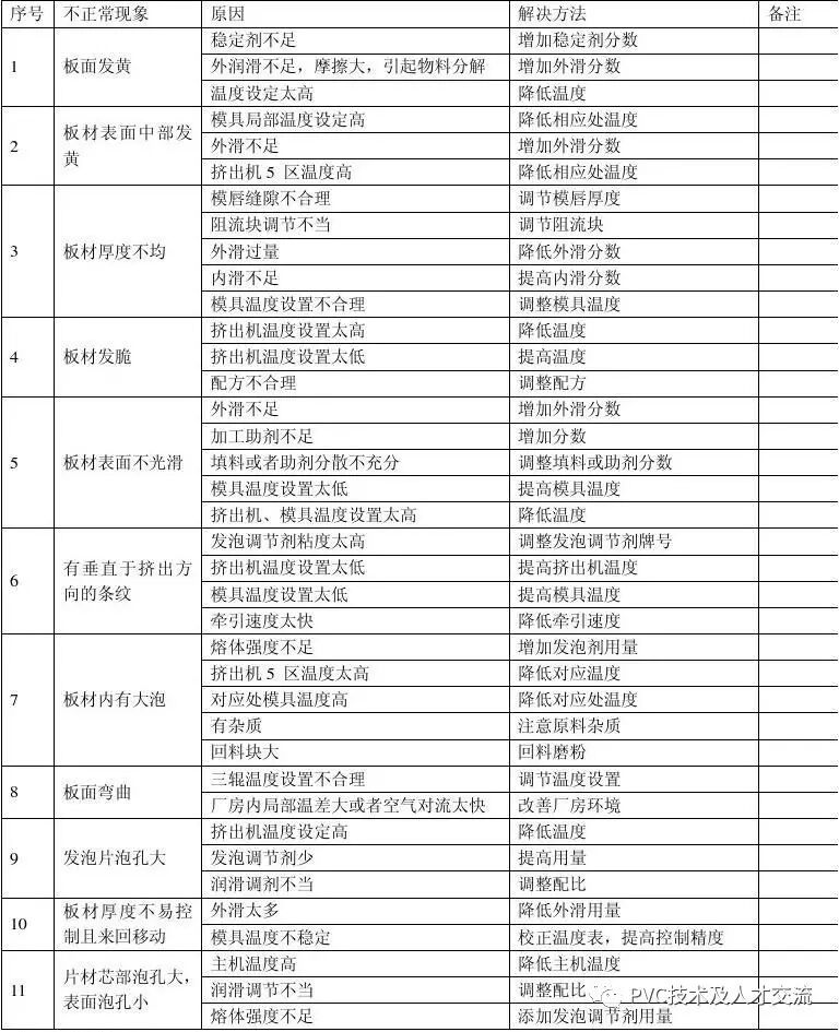 在PVC发泡板材挤出过程中,碰到的问题基本可以归为4类,一是稳定性问题;二是熔体强度问题;三是润滑问题;四是分散问题。这四类问题特别是前三类问题会相互制约,交叉